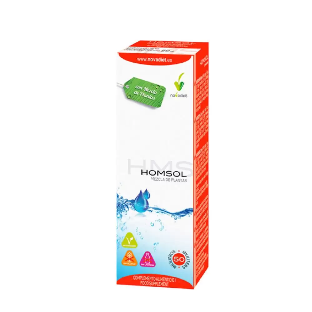 Homsol 50 ml Novadiet es un complemento alimenticio líquido elaborado con una mezcla de extractos de plantas y algas, tradicionalmente utilizadas para favorecer la depuración del organismo, apoyar la eliminación de líquidos y acompañar programas de control de peso.