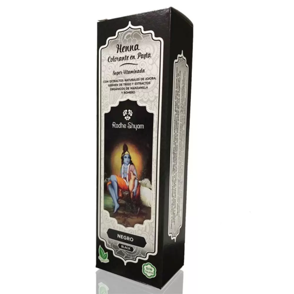 Tinte Natural en pasta Supervitaminado para el pelo a base de plantas, que cuida y nutre la piel, del que se obtiene un color Negro.La Henna en pasta es un tinte natural hecho a base de plantas de origen ecológico, la que la convierte en la opción más saludable del mercado. Ademas, es Súper-Vitaminada, ya que le hemos añadido Germen de Trigo, Jojoba, extractos de Manzanilla y Romero procedentes de cultivo ecológico. Los tintes químicos pueden ser un tratamiento muy agresivo para la piel, provocando en muchas ocasiones irritaciones, sarpullidos, picores, etc. En cambio, la Henna al ser un tratamiento natural, también cuida la piel nutriendo e hidratándola, previniendo así la caspa y la caída del cabello. También le añade brillo y volumen al cabello, haciendo que los resultados sean más espectaculares. Con el color Negro se obtiene un color negro oscuro.