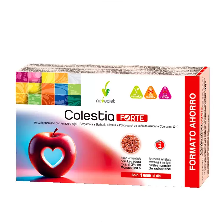 Colestia Forte 30 cápsulas Novadiet es una fórmula avanzada que combina bergamota, berberina, arroz fermentado con levadura roja, policosanol y coenzima Q10, ingredientes utilizados habitualmente para ayudar a mantener niveles normales de colesterol y apoyar la salud cardiovascular.