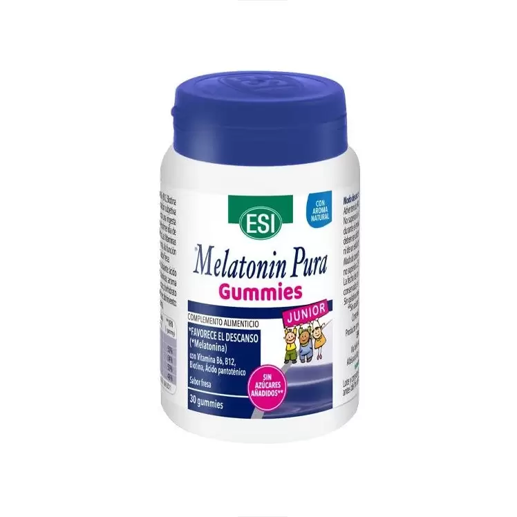 ESI Melatonin Pura Gummies Junior combina la melatonina, hormona natural implicada en la regulación del ciclo sueño-vigilia, con vitaminas del grupo B que apoyan el funcionamiento normal del sistema nervioso.